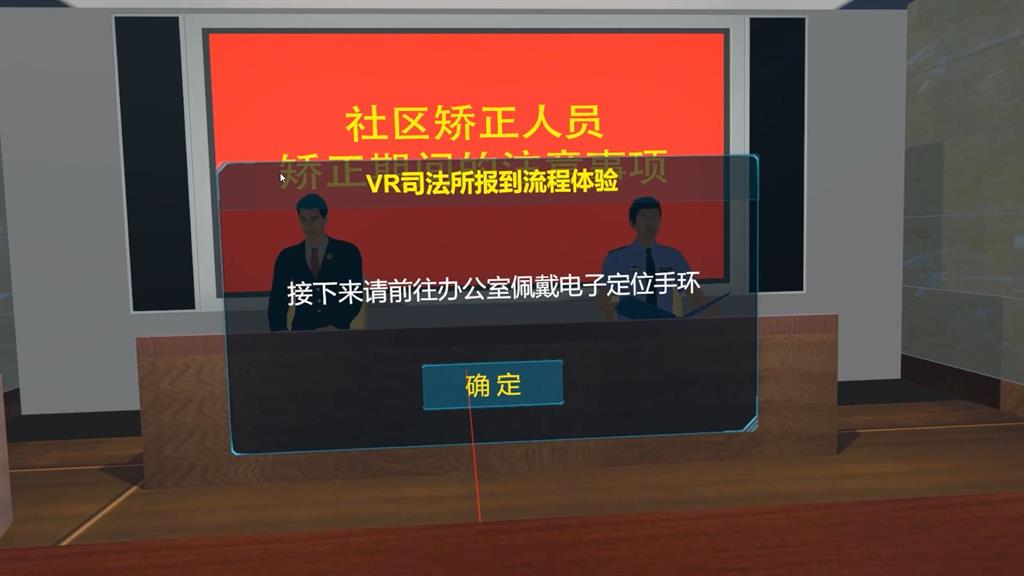 模擬整個司法報到和辦理社區(qū)矯正等流程,體驗者以第一視角攜帶相關(guān)證明到司法所完成相應(yīng)的報到程序,包括進(jìn)入司法所、填寫信息、做心理健康測試、宣讀矯正規(guī)定、佩戴電子手環(huán)等。