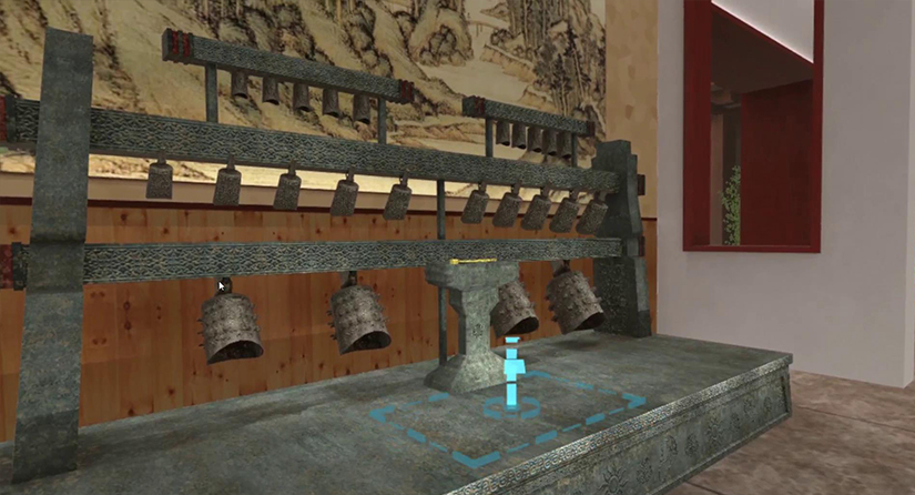 樂,即古代所指六樂:《云門大卷》、《咸池》、《大韶》、《大夏》、《大濩》、《大武》六套樂舞,是我國古代音樂藝術(shù)的經(jīng)典范式。展廳將直觀展示古樂的編鐘與鼓的樣式結(jié)構(gòu),并可以通過VR設(shè)備(手柄)去敲擊編鐘與鼓聽到真實(shí)的聲音,全部聲音使用的是原件文物實(shí)地采音,非常真實(shí)。