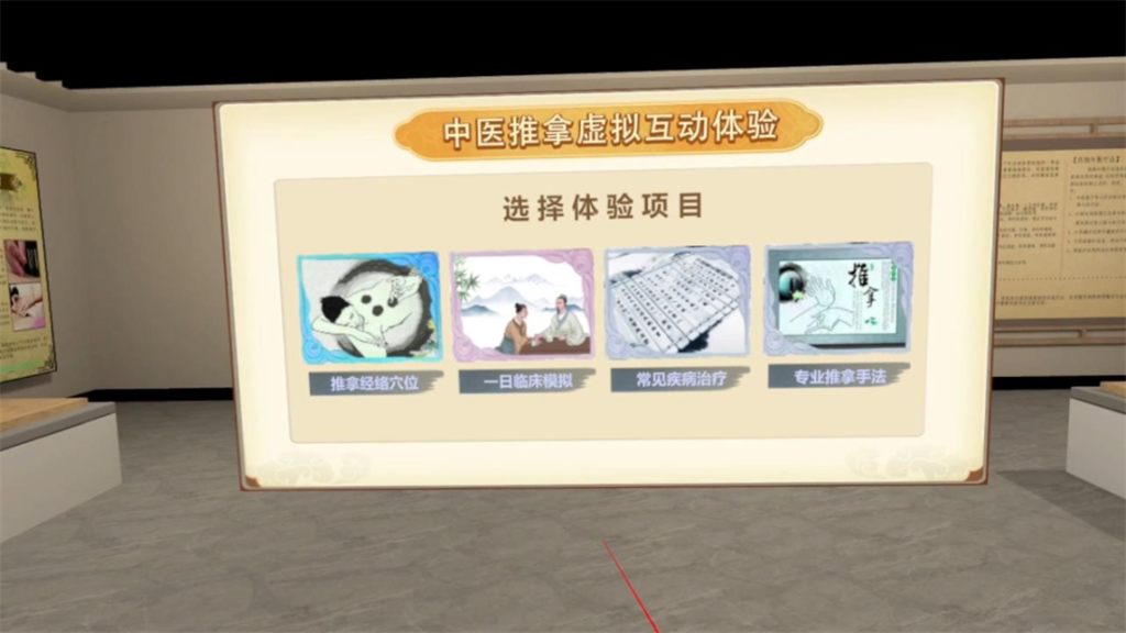 系統(tǒng)通過模擬真實的推拿環(huán)境,讓體驗者在仿真場景中學(xué)習(xí)推拿的多種手法,包括但推、揉、捏等技巧,除此之外還有數(shù)種病例體驗場景,讓體驗者進(jìn)行模擬操作。