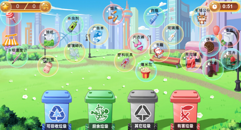 體感垃圾分類游戲,玩家需伸手移動(dòng)光標(biāo)選擇游戲開始,游戲中會(huì)有不同的垃圾落向地面需要玩家伸手握拳抓住這些垃圾,并把它放到正確的垃圾桶內(nèi)。拖放正確+5分,錯(cuò)誤-3分。在規(guī)定時(shí)間內(nèi),獲得分?jǐn)?shù)越高,成績(jī)?cè)胶?。游戲結(jié)束,成績(jī)夠好,會(huì)有排名。