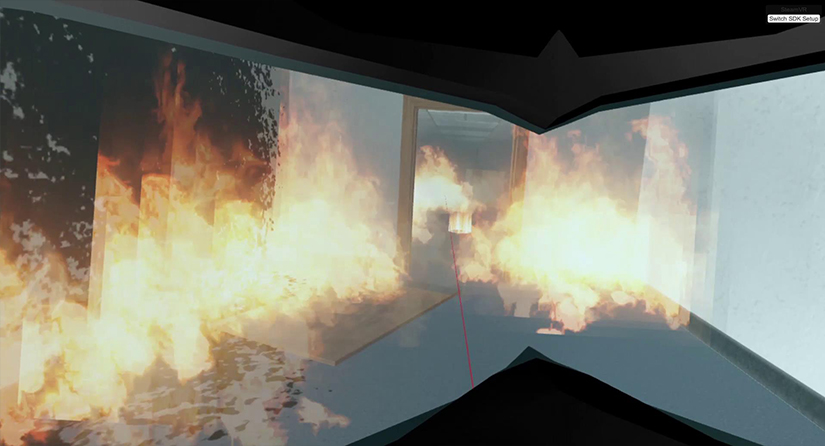 本系統(tǒng)基于三維建模、仿真引擎等技術(shù),配合HTC-viveVR外設(shè),模針公寓火災(zāi)發(fā)生,消防戰(zhàn)士滅火并實施相應(yīng)的應(yīng)急措施救援體驗。