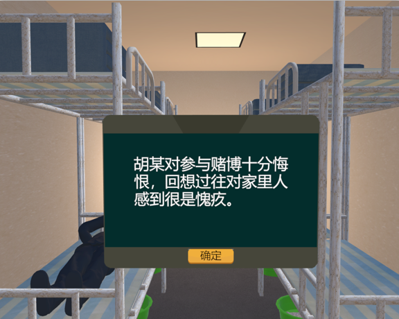 本系統(tǒng)以社區(qū)矯正人員胡某參與賭博的視角。進(jìn)行了胡某朋友拉人賭博,胡某女兒進(jìn)行勸阻,胡某置之不理參與賭博,賭博時(shí)被捕,被捕后深深懊悔,釋放后被催債,后來妻離子散,感到整個(gè)世界都崩塌了的體驗(yàn)。內(nèi)容故事流程:1.進(jìn)入VR世界中,介紹背景,擁有美好家庭。2.有朋友湊打麻將,女兒對你進(jìn)行勸說,不顧勸說進(jìn)行打麻將活動(dòng)。3.打麻將過程中警察進(jìn)入,將社矯人員進(jìn)行抓捕。4.因在社矯期間進(jìn)行賭博,撤銷監(jiān)外執(zhí)行,執(zhí)行收監(jiān)。5.在監(jiān)中回想種種過往,對過往進(jìn)行反思后悔。6.由于賭博造成外...