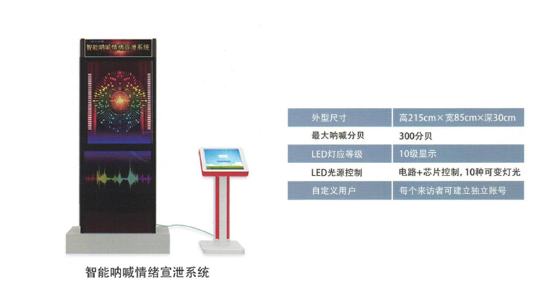 智能引導(dǎo)正向激勵(lì):系統(tǒng)智能分析宣泄者的行為(包括吶喊分貝、宣泄時(shí)間等因素),判斷出其情緒宣泄的程度,根據(jù)不同宣泄的程度進(jìn)行智能化的正向語(yǔ)音引導(dǎo)、激勵(lì),并給予建議方案。多種宣泄情緒主題:系統(tǒng)提供了8種常見的情緒問(wèn)題而設(shè)定的宣泄主題,用戶使用前先通過(guò)觸摸屏控制器選擇符合自己情緒的宣泄主題。系統(tǒng)設(shè)置管理員登陸口,方便管理及調(diào)取記錄。
