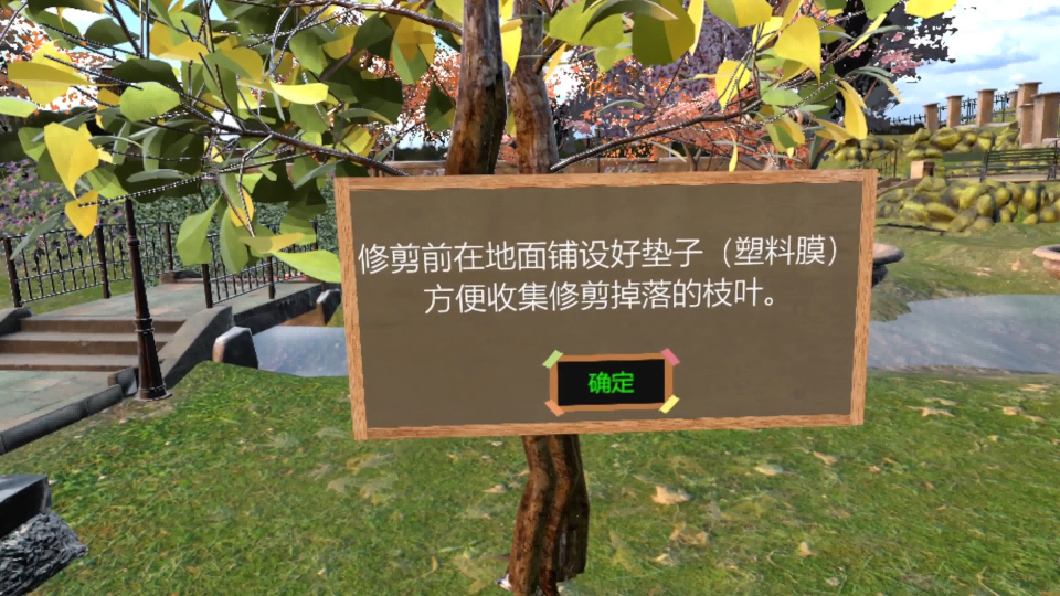 VR園藝工培訓(xùn)場景,還原園藝修剪技能實(shí)操,虛擬仿真園林場景,體驗(yàn)者學(xué)習(xí)使用修剪樹木,園林剪、電鋸等工具,并通過系統(tǒng)交互,按照語音指示使用電鋸對樹墻進(jìn)行修剪,使用高枝鋸對果樹進(jìn)行修剪等園藝修剪任務(wù)。