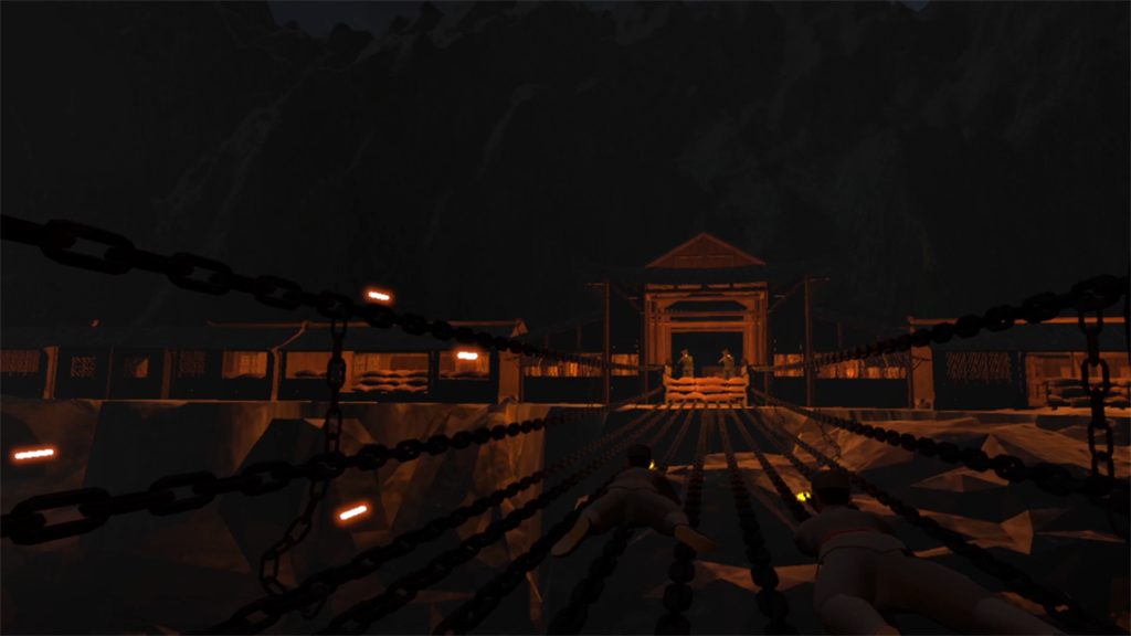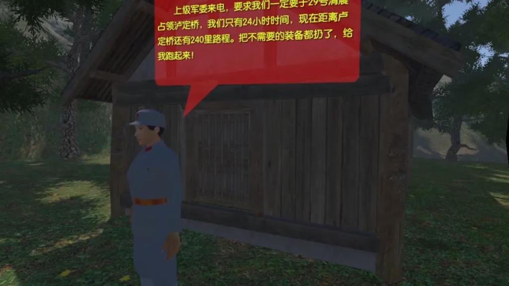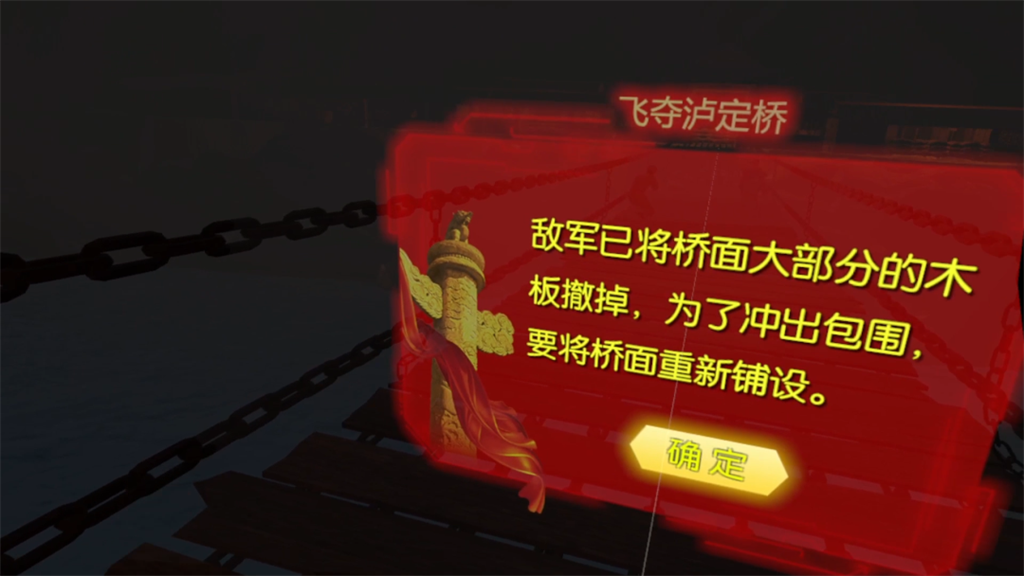 在VR飛奪瀘定橋體驗系統2.0中,體驗者載上VR眼鏡,穿越到1935年5月29日的那天夜晚,眼前便是瀘定橋,橋面腳下是鎖鏈森森,江水濤濤,稍有不慎就會遇險落水。環(huán)顧四周,戰(zhàn)友們在槍林彈雨中努力前進。拿起手彈,用力一擲,手榴彈便在敵方陣中應聲爆炸,熱血澎湃的你恨不得射光所有的子彈,將敵人全部消滅,但是夜色昏暗,橋面不穩(wěn),沒有遮擋,你和戰(zhàn)友們只能抓緊鎖鏈,躲避子彈,緩慢前進。