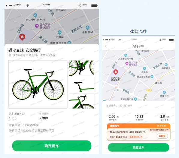提供兩臺(tái)真實(shí)的共享單車,配合平板電腦上的單機(jī)版共享單車APP,完美還原真實(shí)使用場(chǎng)景。參與者可以通過掃碼開鎖,體驗(yàn)從解鎖到還車的完整流程。
