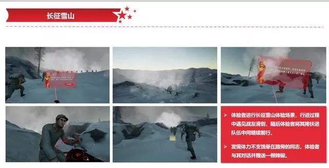 工作人員戴上VR眼鏡,可以重溫長(zhǎng)征路,體驗(yàn)當(dāng)年農(nóng)軍爬雪山的艱難。在雪山體驗(yàn)場(chǎng)景里,你將扮演一名紅軍戰(zhàn)士,在行進(jìn)過(guò)程中遇見(jiàn)戰(zhàn)友滑到,遇見(jiàn)體力不支餓暈在路旁的同志,還會(huì)遇見(jiàn)教科書(shū)本上為了革命而犧牲的軍需處長(zhǎng)。這些原本在教課書(shū)上發(fā)生的故事情節(jié),通過(guò)VR我們蹦栩栩如生在眼前展示。