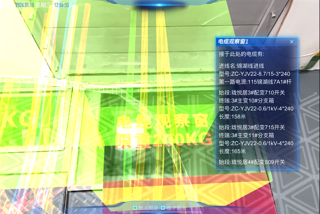 巡檢模式下,ipad的拍攝模式一直打開,然后工作人員拿著ipad于室外指定區(qū)域行走,對著展示的電纜井或電纜管線,點(diǎn)擊對應(yīng)模型,可以打開數(shù)據(jù)面板或電纜截面圖(電纜井為數(shù)據(jù)面板,電纜管線為截面圖),點(diǎn)擊截面圖上標(biāo)識名稱的管線截面,可以打開對應(yīng)的管線數(shù)據(jù)面板。